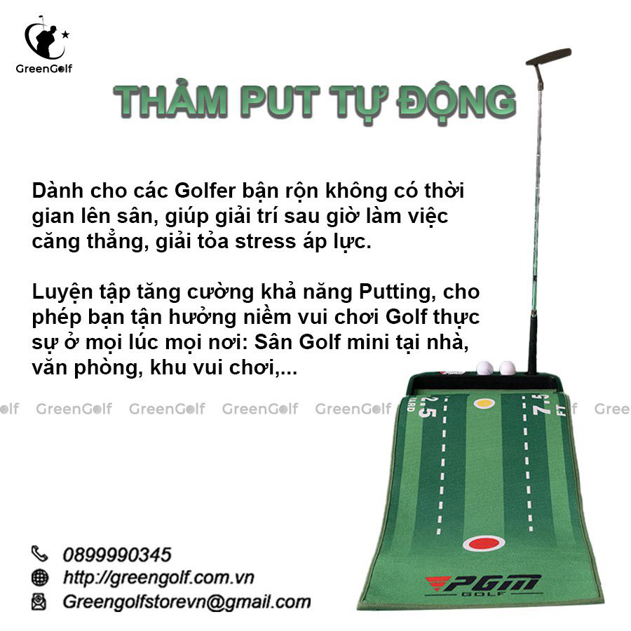 Thảm tập Golf Put tự động bật bóng là sản phẩm rất hữu ích cho những người yêu thích môn thể thao Golf luyện cú Putt (gạt bóng) trên Green. Sản phẩm này hiện đang bán rất chạy tại Green Golf. Chúng tôi thường sản xuất và cung cấp ra thị trường số lượng lớn, phân phối trên khắp toàn quốc. Với chiếc thảm này, bạn có thể tập xác định đường đi của bóng để thực hiện những cú gạt chính xác và hoàn hảo. Cùng với PUT tự động bật bóng thì đây hứa hẹn sẽ là sản phẩm mà Green Golf sẽ đẩy mạnh trong kế hoạch phát triển sắp tới.