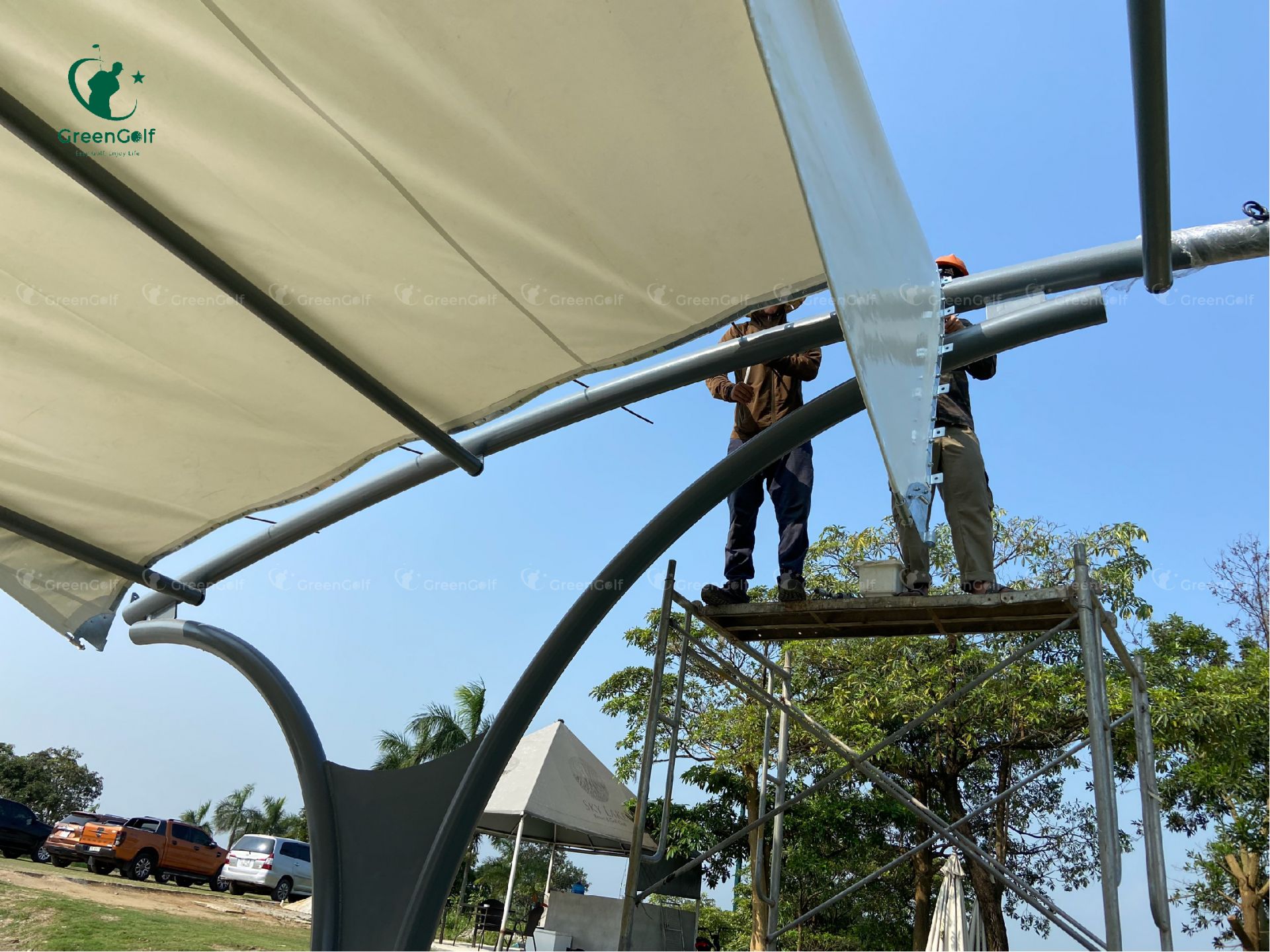 Với diện tích tổng cộng 500m2, sân tập golf tại Sky Lake được thiết kế theo hình vòng cung, tạo nên một không gian tinh tế, sang trọng và độc đáo. Phần mái của sân tập được làm từ bạt chất lượng cao, nhập khẩu trực tiếp từ châu Âu, đảm bảo độ bền vượt trội và khả năng chống thời tiết tuyệt vời. Đặc biệt, các cột chữ "Y" độc đáo mang đến sự chắc chắn và thẩm mỹ cho không gian sân tập.