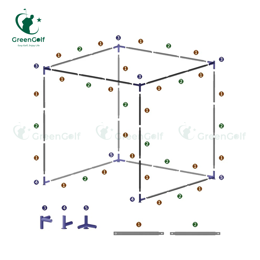 Bộ khung tập golf được lắp ráp bằng những ống thép mạ kẽm gắn với nhau bởi khẩu nối góc phi 34 cao cấp. Sau khi hoàn chỉnh khung thép thì nhân viên kỹ thuật của Green Golf sẽ lắp lưới vào khung. Bộ khung với 25 ống sắt tĩnh điện cao cấp bên ngoài được bao ôm bằng xốp cao cấp nên độ bền cao theo năm tháng. Khung chống oxi hóa tuổi thọ cao